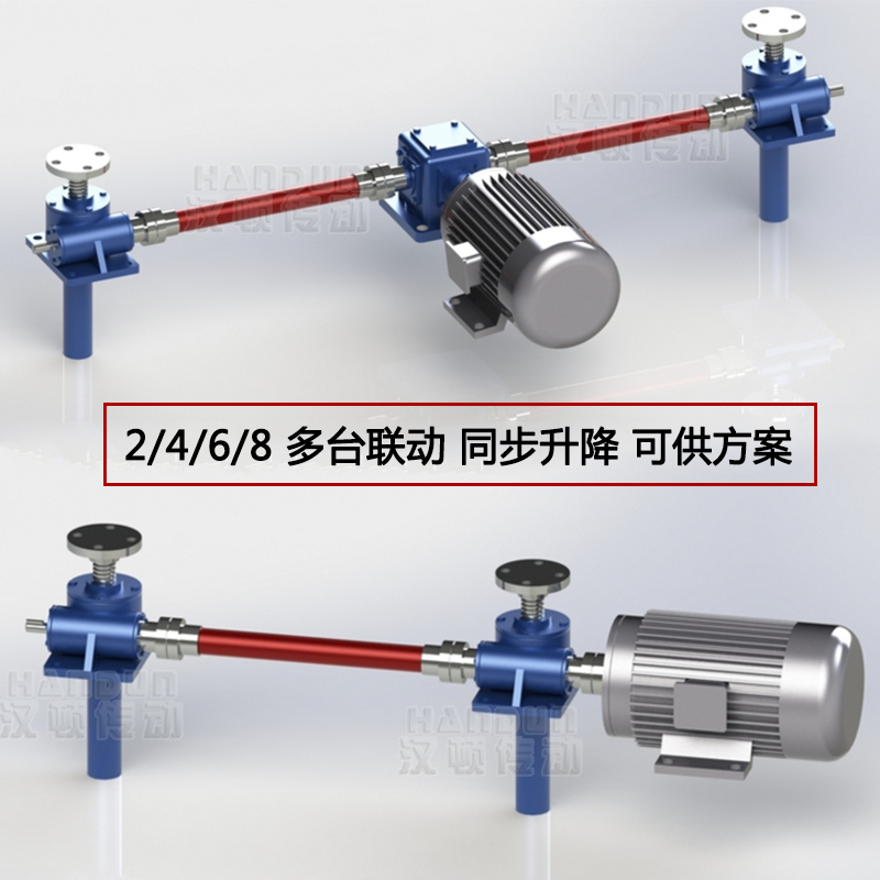 電機(jī)在升降機(jī)的一端,與其中一臺升降機(jī)的入軸連接。另一端升降機(jī)的入軸可以連接編碼器或手輪,如果不需要也可以不加。