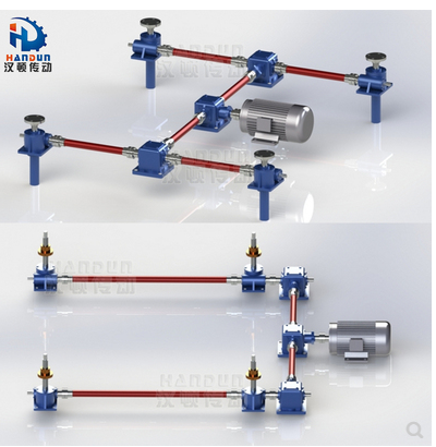 三臺升降機(jī)出軸用一臺T型轉(zhuǎn)向器連接,升降機(jī)呈三足鼎立狀態(tài),電機(jī)連接在中間一臺升降機(jī)的出軸上。