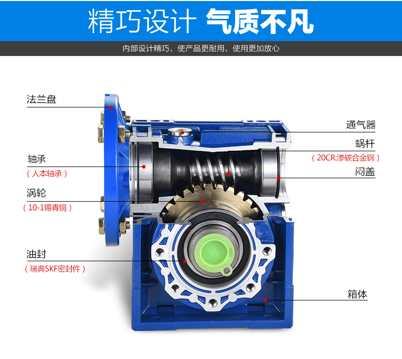 RV系列鋁合金微型蝸桿減速器是我司研制的新一代實(shí)用型產(chǎn)品,符合Q/JF01-1999標(biāo)準(zhǔn),按最新國家標(biāo)準(zhǔn)設(shè)計(jì),采用新工藝、新材料生產(chǎn)、吸收了國外技術(shù)并加以創(chuàng)新,使其整機(jī)性能優(yōu)于國內(nèi)同類型產(chǎn)品。適用于食品、皮革、紡織、醫(yī)療、玻璃、陶瓷、化工、輕工等機(jī)械設(shè)備的減速傳動(dòng),是現(xiàn)代化傳動(dòng)系統(tǒng)實(shí)現(xiàn)單機(jī)傳動(dòng)及生產(chǎn)流水線上實(shí)現(xiàn)機(jī)電一體化的最佳選擇。該系列產(chǎn)品顯著特點(diǎn):方箱外形,優(yōu)質(zhì)鋁合金壓鑄箱體,美觀大方;散熱性能好,承載能力大;多面安裝,空心軸輸出軸結(jié)構(gòu),另配有各種輸入、輸出方式,并能方便地與其他傳動(dòng)機(jī)械組合,適應(yīng)性能強(qiáng)傳動(dòng)平穩(wěn),噪音小,安全可靠,經(jīng)濟(jì)耐用。